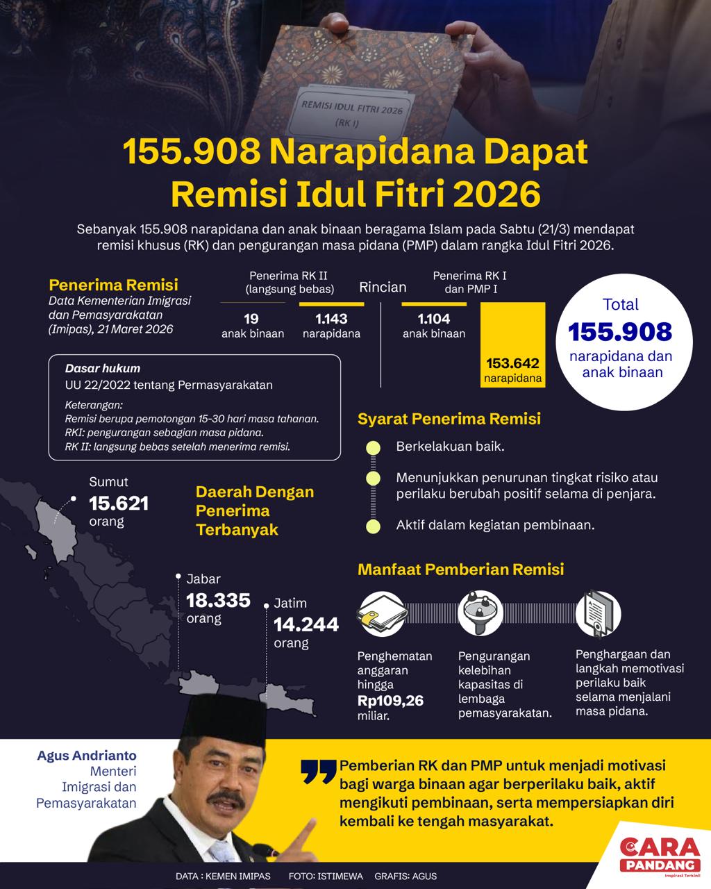 Beranda Infografis 155.908 Narapidana Dapat Remisi Idulfitri 2026 Infografis 155.908 Narapidana Dapat Remisi Idulfitri 2026 Penulis Amira Izzati - 23 Maret 2026 22:26 0 155.908 Narapidana Dapat Remisi Idulfitri 2026 Tags Berita Sebelumnya Ketua Partai Demokrat Israel: Netanyahu Sengaja Perpanjang Perang untuk Pertahankan Kekuasaannya Berita Berikutnya Pimpinan MPR Sebut Perlu Ada Kebijakan dan Aksi Responsif Hadapi Panas Ekstrem di Indonesia LEAVE A REPLY Cancel reply Comment: Please enter your comment! Name:* Please enter your name here Email:* You have entered an incorrect email address! Please enter your email address here Website: Save my name, email, and website in this browser for the next time I comment. Berita Teratas Jual Beli Emas Tidak Dilarang Selama Bukan dari Hasil Ilegal Wabup Iwan Ikuti Rakor Pengendalian Inflasi Daerah 2026 H-1 Lebaran, Jajaran Forkopimda Pohuwato Lakukan Pemantauan dan Pengecekan di Sejumlah Pos Wabup Iwan Kunjungi Puluhan Pasien di RSUD Bumi Panua Songsong Idulfitri, Personel Kodim 1313/Pohuwato Ambil Bagian dalam Pengamanan di Rest Area UPPKB Marisa Berita Terkait Berita Terkait