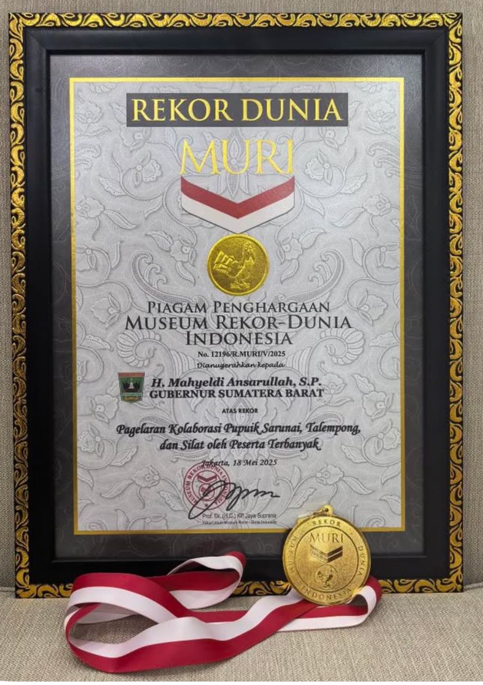 Penghargaan tersebut tercatat dalam Rekor MURI Nomor: 12196/R.MURI/V/2025 dan diserahkan langsung oleh perwakilan MURI kepada Gubernur Mahyeldi yang diwakili oleh Kepala Dinas Pemuda dan Olahraga Sumbar, Maifrizon.