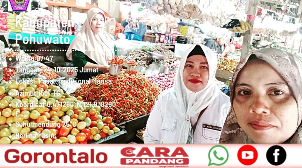POHUWATO, CARAPANDANG - Dinas Perindustrian, Perdagangan, Koperasi dan UKM (Perindagkop dan UKM) Kabupaten Pohuwato melaksanakan kegiatan monitoring harga bahan pokok di Pasar Tradisional Marisa, Jumat (24/10/2025). Kegiatan ini dilakukan untuk memastikan kestabilan harga kebutuhan pokok di tengah masyarakat.