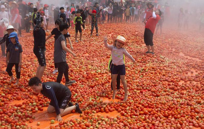 CARAPANDANG.COM, HWACHEON, Korea Selatan -- Orang-orang bersenang-senang di Festival Tomat Hwacheon di Hwacheon-gun, Korea Selatan, menikmati perang tomat bersama keluarga dan teman-teman di tengah musim panas.