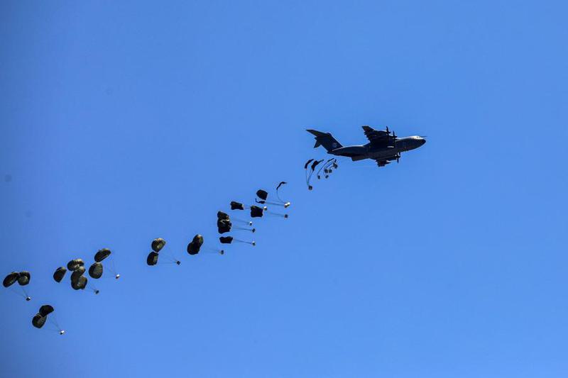 Tentara Yordania menjatuhkan bantuan kemanusiaan di atas wilayah Gaza pada 1 Agustus 2025. (Carapandang/Xinhua/Mohammad Abu Ghosh)