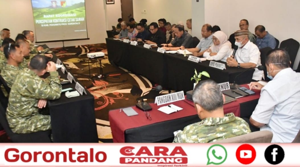 POHUWATO, CARAPANDANG - Rapat Koordinasi (Rakor) Percepatan Cetak Sawah di wilayah Kabupaten Pohuwato kembali digelar dan berlangsung di Hotel Aston Kota Gorontalo, Sabtu (28/02/2026). Rapat tersebut dipimpin langsung Gubernur Gorontalo, Gusnar Ismail, bersama Pangdam XIII/Merdeka, Mayjen TNI Mirza Agus.