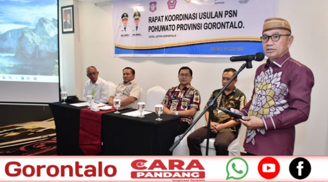 POHUWATO, CARAPANDANG - Rapat Koordinasi Usulan PSN Pohuwato Provinsi Gorontalo yang berlangsung di Aston Hotel Gorontalo dibuka Bupati Pohuwato, Saipul A. Mbuinga didampingi Wakil Bupati ,Iwan S. Adam, dan Ketua DPRD Pohuwato, Beni Nento, Sabtu, (24/05/2025).
