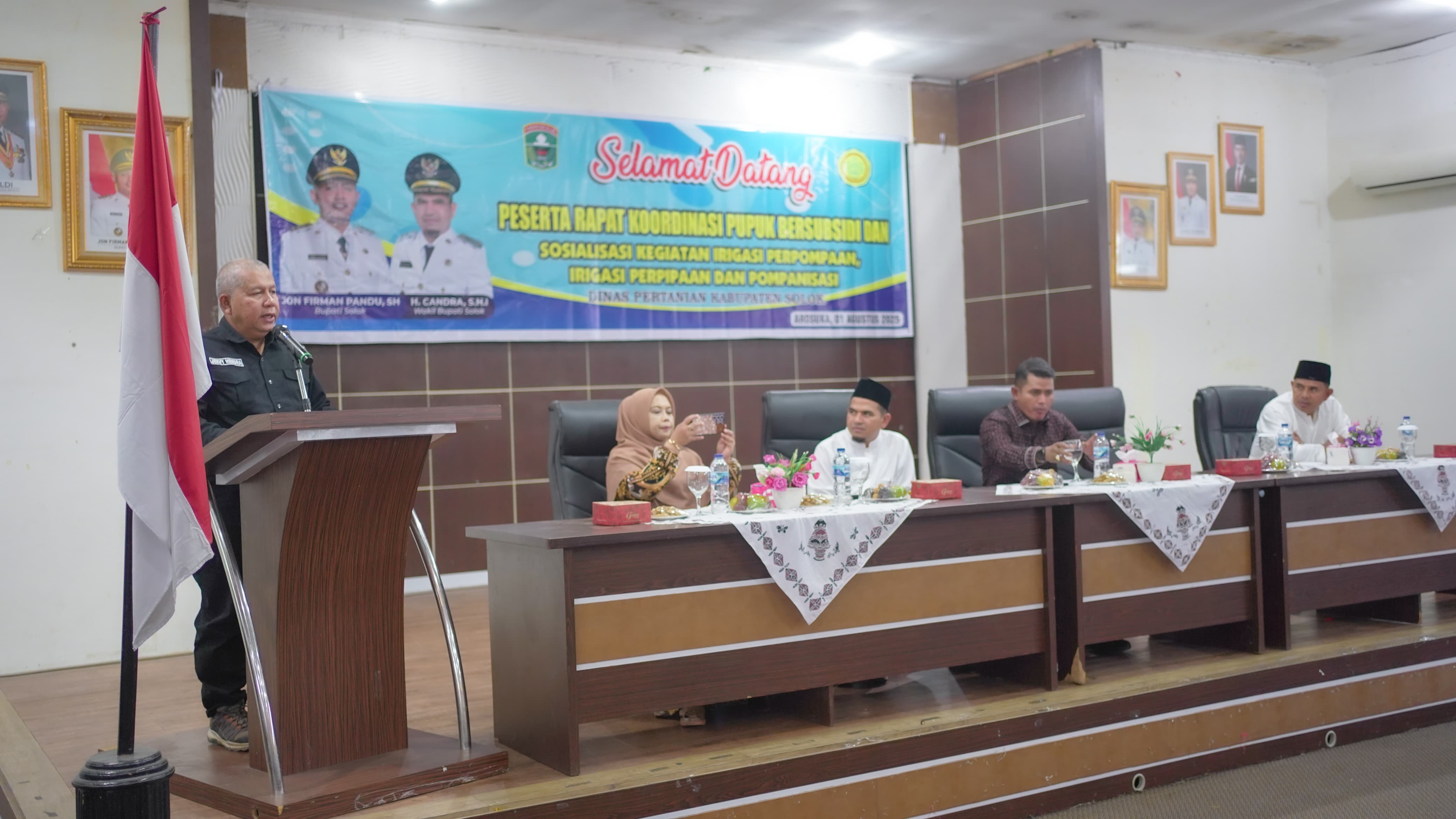 SOLOK, CARAPANDANG - Bupati Solok Jon Firman Pandu, secara resmi membuka Rapat Koordinasi Pupuk Bersubsidi dan Sosialisasi Kegiatan Irigasi Perpompaan, Jum'at (01/08/2025) di Gedung Solok Nan Indah.