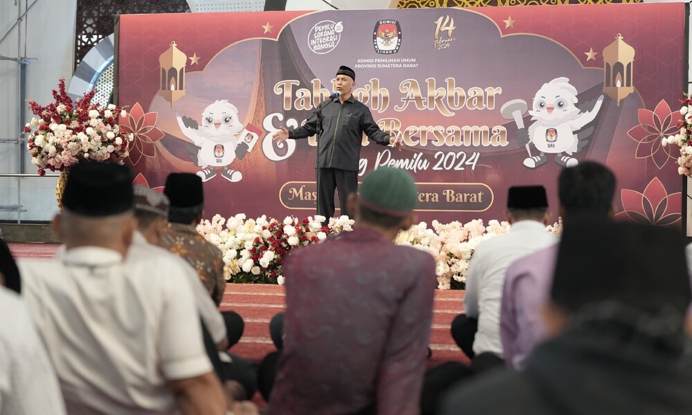 SUMBAR, CARAPANDANG.COM - Gubernur Sumatera Barat (Sumbar), Mahyeldi Ansharullah mengimbau seluruh masyarakat Sumbar untuk menggunakan hak pilih saat Pemilu Serentak 2024 pada 14 Februari 2024 nanti. Imbauan itu disampaikan saat KPU Sumbar menggelar Tabligh Akbar dan Doa Bersama menjelang Pemilu Serentak 2024 di Masjid Raya Sumbar, Kamis (8/2/2024).