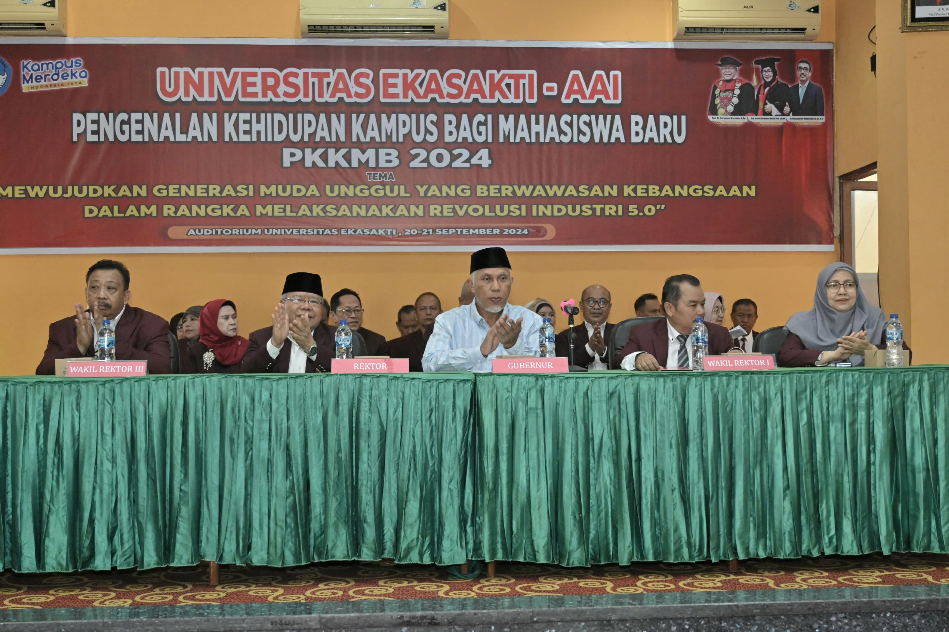 Gubernur Sumatera Barat, Mahyeldi Ansharullah, memompa semangat ribuan mahasiswa baru Universitas Ekasakti (Unes) Padang tahun akademik 2024/2025 dalam momen kegiatan pengenalan kehidupan kampus.