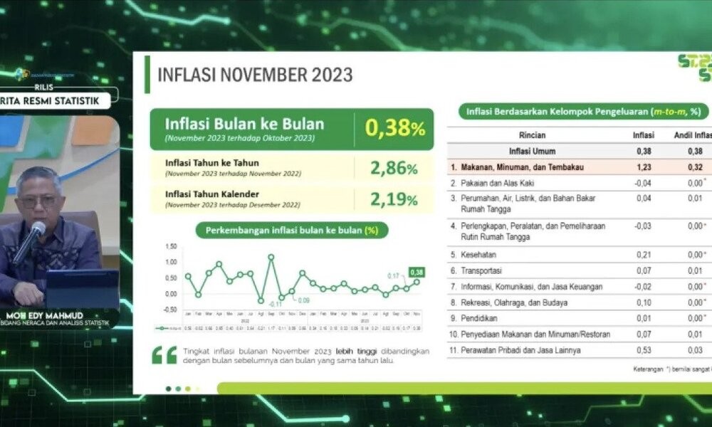 Secara umum, kontribusi inflasi dari kelompok pengeluaran makanan, minuman, dan tembakau yaitu sebesar 0,32 persen dengan besaran inflasi 1,23 persen, menjadi yang paling dominan pada inflasi November.