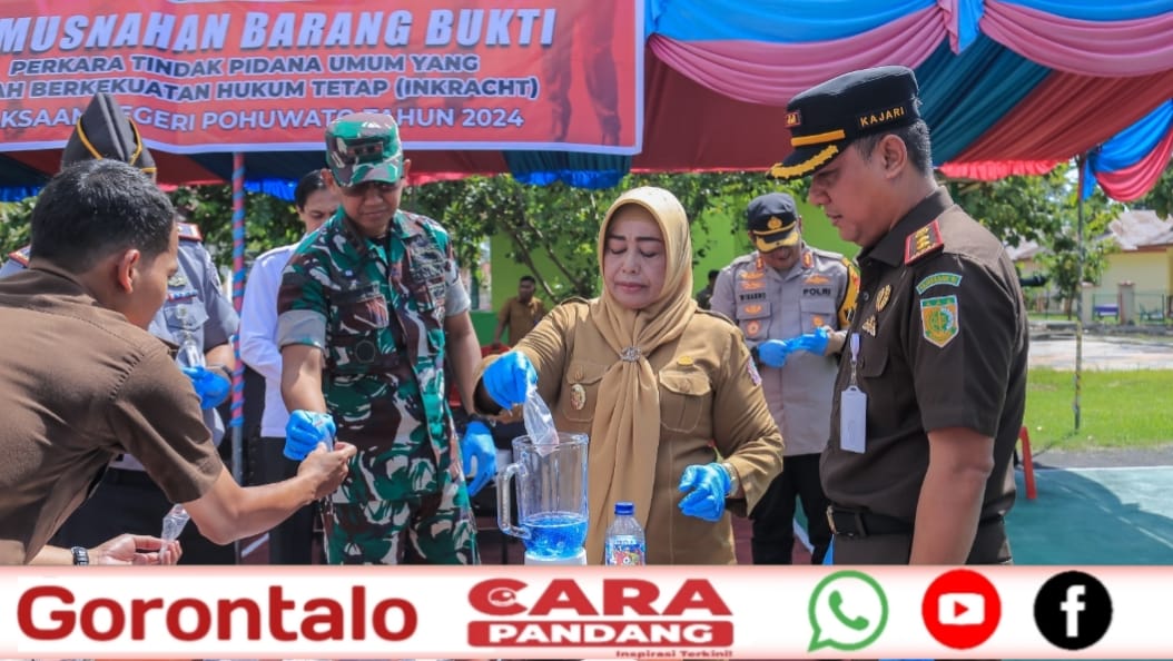 Pemusnahan yang berlangsung di halaman kantor Kejari Pohuwato itu dipimpin langsung oleh Kepala Kejaksaan Negeri Pohuwato, Dr. Arjuna Meghanada Wiritanaya, S.H., M.H dan turut dihadiri Wakil Bupati Pohuwato, Suharsi Igirisa, Kapolres Pohuwato, AKBP Winarno, Dandim 1313 Pohuwato, Letkol Inf Madiyan Surya, serta Kepala Lapas Pohuwato, Tristiantoro Adi Wibowo.