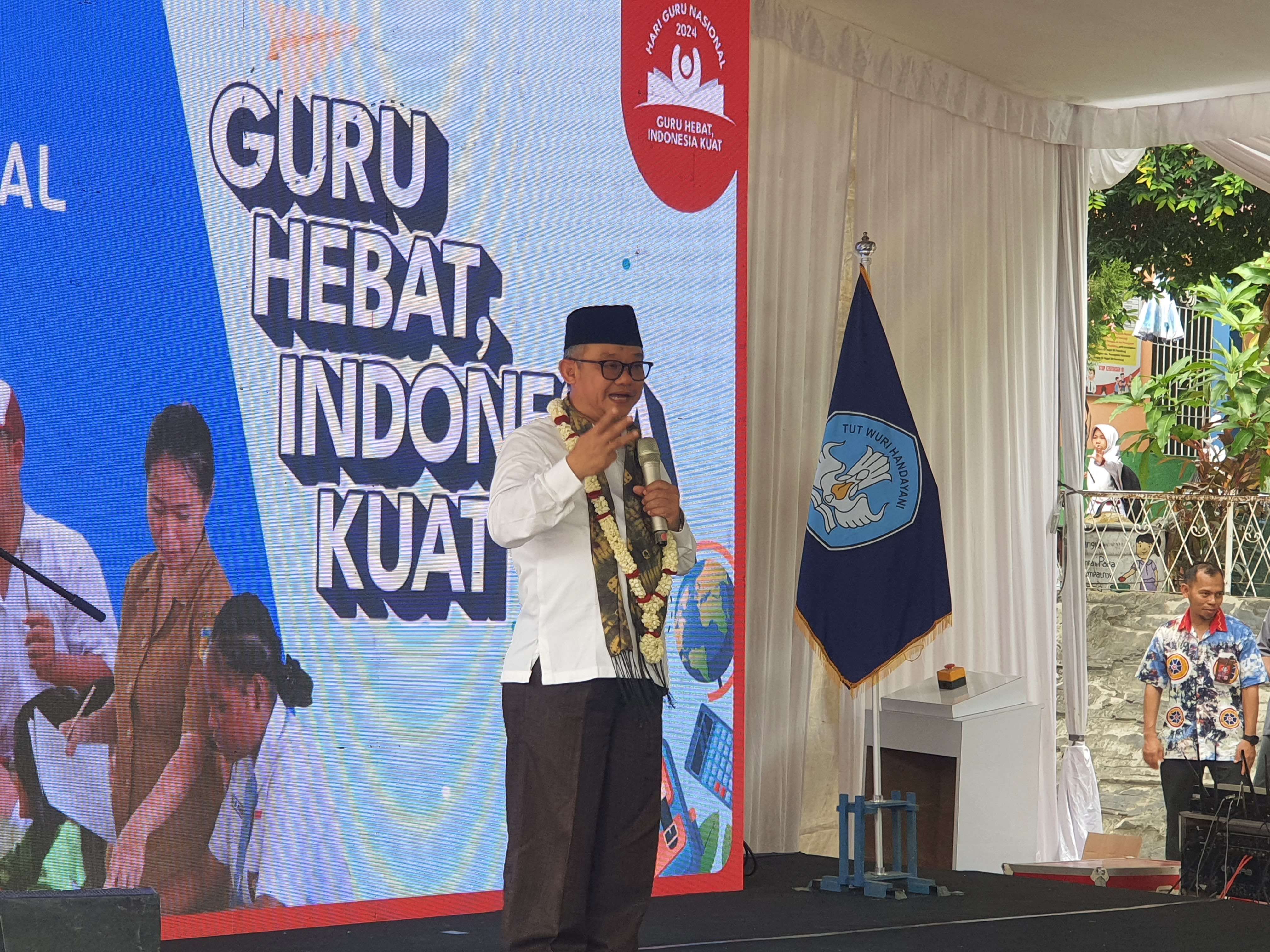 "Orang sekarang bicara mengenai AI (Artificial Intelligence, Red), kecerdasan buatan. Orang bicara mengenai berbagai macam kecanggihan teknologi, semuanya tidak bisa mengalahkan dan menggantikan posisi dan peran guru, sebagai agen pembelajaran dan pencerdasan bangsa," ucapnya.