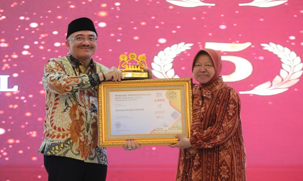 CARAPANDANG - Menteri Sosial RI Tri Rismaharini menerima 4 penghargaan dari Komisi Aparatur Sipil Negara (KASN) dan Badan Kepegawaian Negara (BKN) terkait manajemen ASN, bertampat di Gedung Aneka Bhakti (GAB) Kemensos RI, Jakarta.