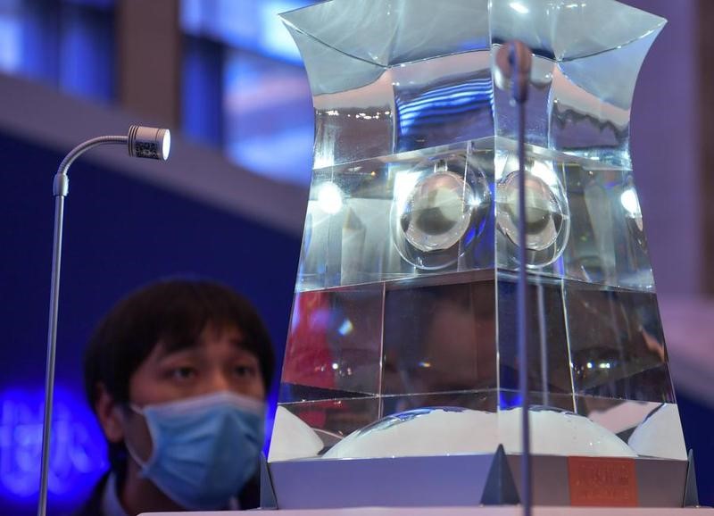 Seorang pengunjung mengamati sampel Bulan yang dibawa pulang oleh wahana antariksa China Chang'e-5 di Museum Nasional China yang berada di Beijing, ibu kota China, pada 18 April 2021. (Xinhua/Yin Dongxun)