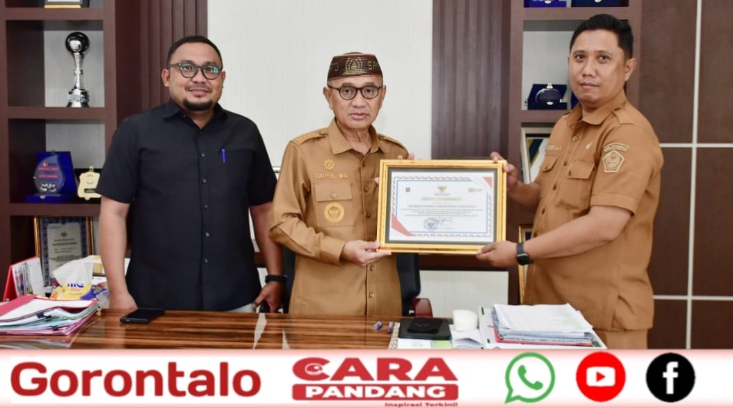 Penghargaan tersebut diserahkan kepada Bupati Pohuwato, Saipul A. Mbuinga, yang didampingi Tenaga Ahli Bupati, Edo Sijaya, oleh Plt. Kepala Badan Kesbangpol Pohuwato, Yuslan Samadi, pada Selasa (09/12/2025) di ruang kerja Bupati Pohuwato.
