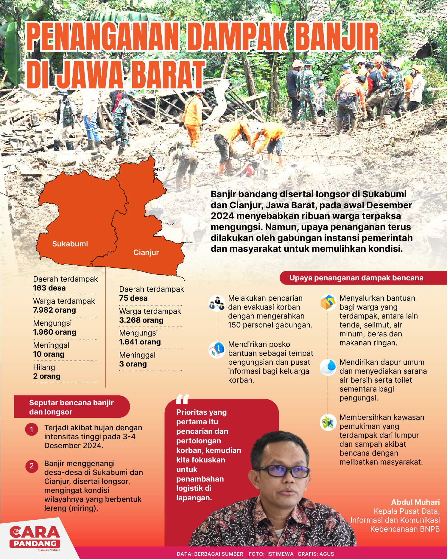 CARAPANDANG - Banjir bandang disertai longsor di Sukabumi dan Cianjur, Jawa Barat, pada awal Desember 2024 menyebabkan ribuan warga terpaksa mengungsi. Namun, upaya penanganan terus dilakukan oleh gabungan instansi pemerintah dan masyarakat untuk memulihkan kondisi.