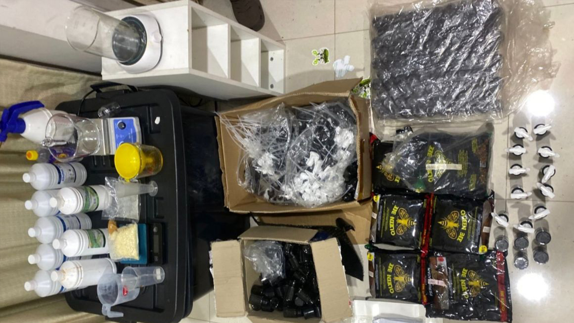 Adapun barang bukti yang diamankan berupa bibit tembakau sintetis seberat 235 gram, 5 kg tembakau produksi, alkohol, botol kaca kemasan, serta kompor listrik untuk produksi tembakau sintetis.