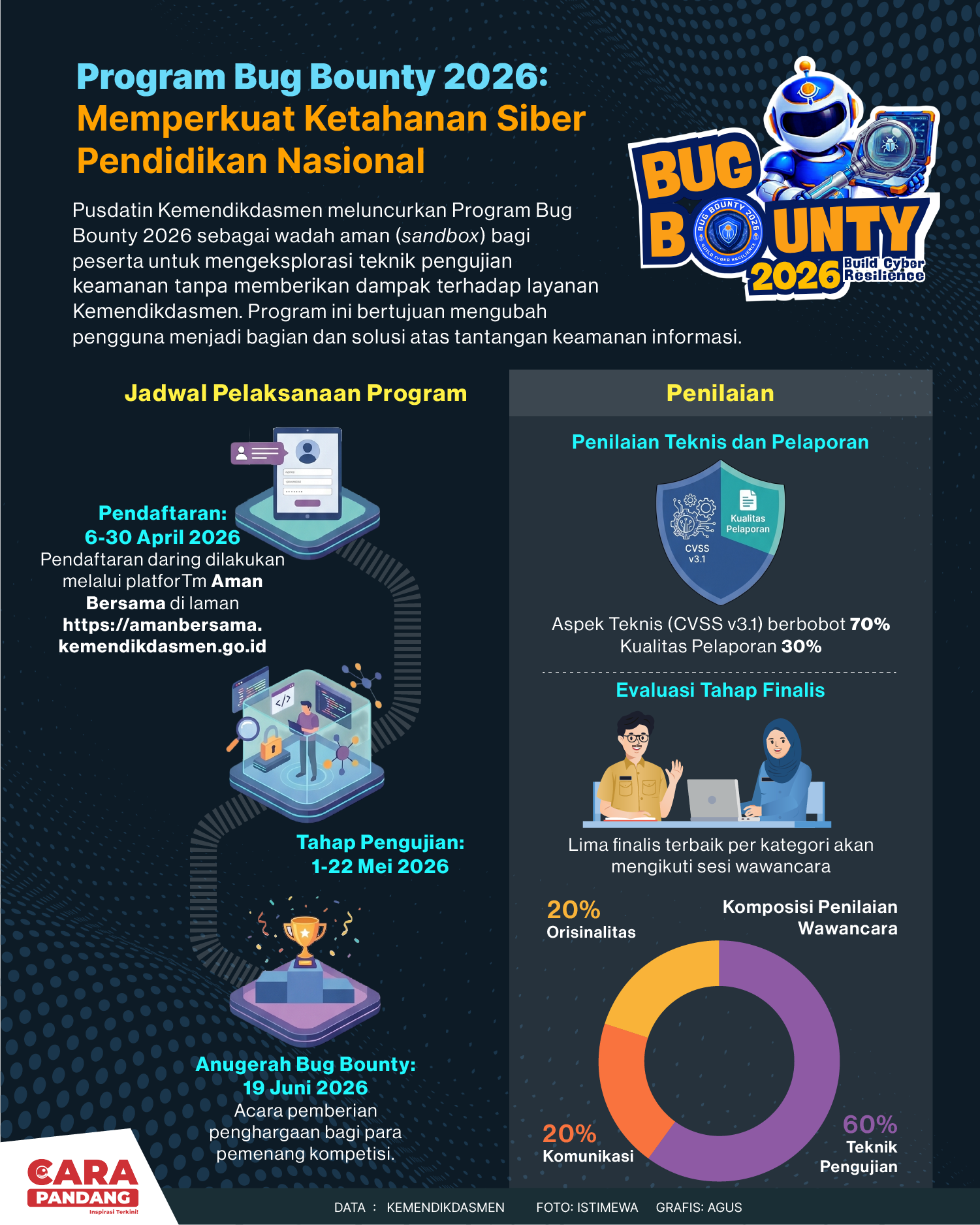 Beranda Infografis Program Bug Bounty 2026, Perkuat Ketahanan Siber Pendidikan Indonesia Infografis Program Bug Bounty 2026, Perkuat Ketahanan Siber Pendidikan Indonesia Penulis Amira Izzati - 15 April 2026 21:44 0 Prgram Bug Bounty 2026, Perkuat Ketahanan Siber Pendidikan Indonesia Tags Berita Sebelumnya Komnas Perempuan: Desak Kasus Dugaan Pelecehan di FH UI diproses Jalur Hukum Berita Berikutnya 3 Tahun Perang Sudan: 59.000 Orang Tewas, Belasan Juta Warga Mengungsi LEAVE A REPLY Cancel reply Comment: Please enter your comment! Name:* Please enter your name here Email:* You have entered an incorrect email address! Please enter your email address here Website: Save my name, email, and website in this browser for the next time I comment. Berita Teratas Cara Tidur Ala Rasulullah, Bagus untuk Kesehatan! Mengunjungi Museum Lokananta di Surakarta, Jawa Tengah Pengamat: Melihat Kebijakan WFH Pada Hari Jumat Sebagai langkah positif Biografi B.J Habibie: Bapak Teknologi Indonesia yang Hebat dan Mengharumkan Nama Bangsa Chrisye: Sang Legenda Musik Indonesia,Inspiratif dan Tak Pernah Padam Ditelan Waktu Berita Terkait Berita Terkait Kolaborasi Tingkatkan Kemampuan Literasi dan Numerasi Siswa Zoel Rachman - 16 April 2026 11:26 Rapor Biru Kinerja Kabinet Merah Putih Maliq - 15 April 2026 14:46 Makin Ugal-ugalan Kini BGN Gelontorkan 6,9 Miliar untuk Belanja Kaos Kaki Zoel Rachman - 13 April 2026 07:53 Wajah Baru PP Tunas: Garda Terdepan Perlindungan Anak Indonesia Zoel Rachman - 31 Maret 2026 09:42