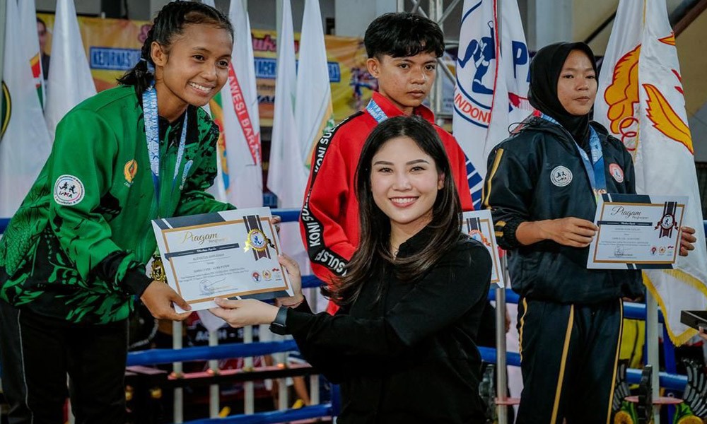 Dalam event tersebut, Wamenparekraf Angela berkesempatan mengalungkan medali kepada para pemenang kejurnas cabor muaythai.