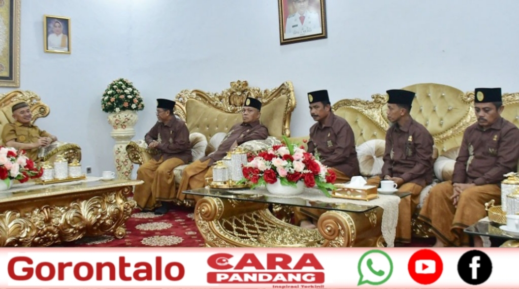 POHUWATO, CARAPANDANG - Tim Safari Syawal Dewan Adat Gorontalo (Duango Adati Lo Hulontalo) yang dipimpin Ketua Harian, Alim S. Niode didampingi Sekjen Dewan Adat, Hi. Nurdin Mohamad, S.Ag., M.Hi, Anggota Dewan Adat/Wu'u Lo Hungina'a Telaga Jaya, Yunus Hako, SE, Anggota Dewan Adat/Wu'u Lo Hulonthalo to Kota Tengah, Karmin Delatu, dan Anggota Pengurus Dewan Adat Gorontalo, Asmad N. Tuna/Baate Lo Hulontalo to Pohuwato, melakukan silaturahmi dengan Bupati Pohuwato, Saipul A. Mbuinga. Pertemuan perdana tersebut berlangsung di rumah jabatan bupati, Selasa (14/04/2026).