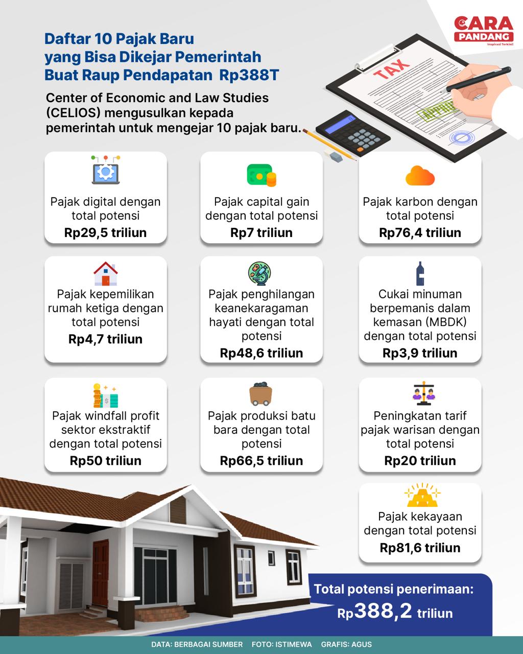 Beranda Infografis 10 Pajak Baru yang Bisa Dikejar Pemerintah untuk Raup Rp388 Triliun Infografis 10 Pajak Baru yang Bisa Dikejar Pemerintah untuk Raup Rp388 Triliun Penulis Amira Izzati - 15 Agustus 2025 21:13 0 10 Pajak Baru yang Bisa Dikejar Pemerintah untuk Raup Rp388 Triliun Tags Berita Sebelumnya Puan Ingatkan Kebijakan Harus Berorientasi pada Kepentingan Rakyat Berita Berikutnya Indonesia Dalam Dilema Misi Perdamaian Dunia LEAVE A REPLY Cancel reply Comment: Please enter your comment! Name:* Please enter your name here Email:* You have entered an incorrect email address! Please enter your email address here Website: Save my name, email, and website in this browser for the next time I comment. Berita Teratas Kisah Ajaib Nabi Sulaiman dan Anak yang Berbakti kepada Orang Tua 8 Cara Merawat Kucing Kesayangan Agar Tubuhnya Selalu Sehat Minuman yang Mampu Redakan Batuk yang Menganggu Manfaat Ajaib Bawang Putih Bagi Kesehatan 8 Cara Menjaga Kesehatan Gigi dan Mulut yang Efektif Berita Terkait Berita Terkait Wajah Baru PP Tunas: Garda Terdepan Perlindungan Anak Indonesia Zoel Rachman - 31 Maret 2026 09:42 MBG 5 Hari Sepekan Masih Wacana Maliq - 30 Maret 2026 11:49 Presiden Ingin Semua Kendaraan Dikonversi ke Listrik Maliq - 30 Maret 2026 11:48 Kewaijiban PSE Terhadap Pengguna Anak Maliq - 30 Maret 2026 11:15