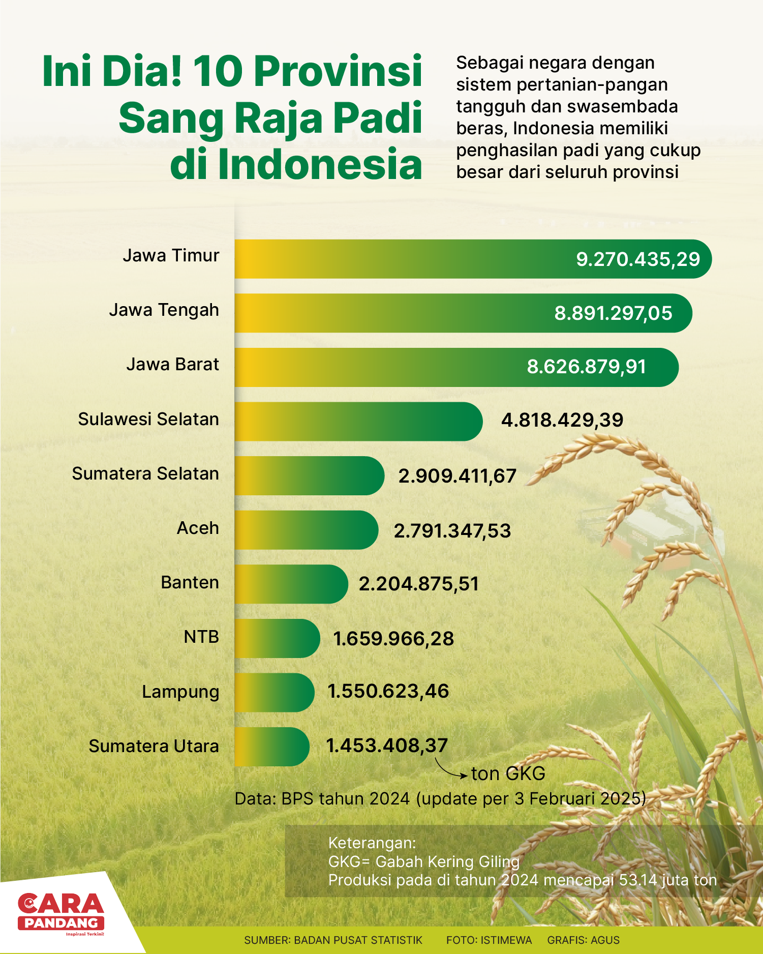 Beranda Infografis 10 Provinsi Raja Padi di Indonesia Infografis 10 Provinsi Raja Padi di Indonesia Penulis Amira Izzati - 11 April 2025 21:36 0 CARAPANDANG - 10 Provinsi Raja Padi di Indonesia Tags Berita Sebelumnya DPR: Penghapusan Kuota Impor Bumerang bagi Perekonomian Nasional Berita Berikutnya Indonesia Dalam Dilema Misi Perdamaian Dunia LEAVE A REPLY Cancel reply Comment: Please enter your comment! Name:* Please enter your name here Email:* You have entered an incorrect email address! Please enter your email address here Website: Save my name, email, and website in this browser for the next time I comment. Berita Teratas Kisah Ajaib Nabi Sulaiman dan Anak yang Berbakti kepada Orang Tua 8 Cara Merawat Kucing Kesayangan Agar Tubuhnya Selalu Sehat Minuman yang Mampu Redakan Batuk yang Menganggu Manfaat Ajaib Bawang Putih Bagi Kesehatan 8 Cara Menjaga Kesehatan Gigi dan Mulut yang Efektif Berita Terkait Berita Terkait Wajah Baru PP Tunas: Garda Terdepan Perlindungan Anak Indonesia Zoel Rachman - 31 Maret 2026 09:42 MBG 5 Hari Sepekan Masih Wacana Maliq - 30 Maret 2026 11:49 Presiden Ingin Semua Kendaraan Dikonversi ke Listrik Maliq - 30 Maret 2026 11:48 Kewaijiban PSE Terhadap Pengguna Anak Maliq - 30 Maret 2026 11:15
