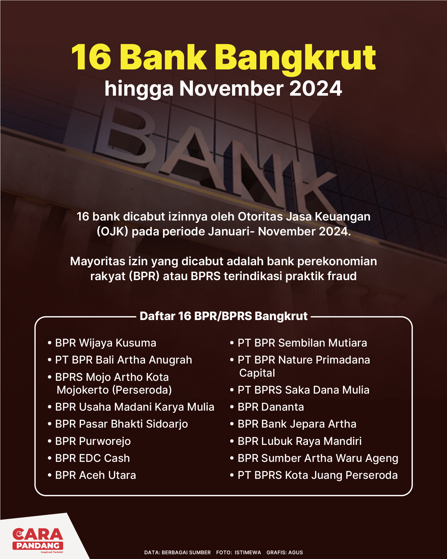 CARAPANDANG - Sebanyak 16 bank dicabut izinnya oleh Otoritas Jasa Keuangan (OJK) pada periode Januari-November 2024. Mayoritas izin yang dicabut merupakan bank perekonomian rakyat (BPR) atau BPRS terindikasi melakukan praktik fraud.