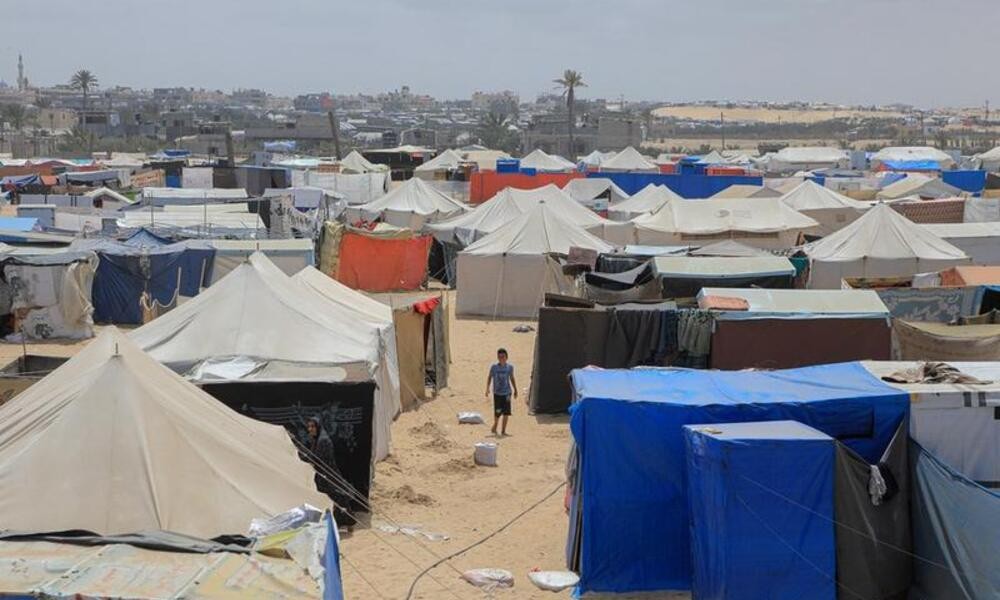Orang-orang terlihat di sebuah kamp sementara di Kota Rafah, Jalur Gaza selatan, pada 27 April 2024. (Xinhua/Rizek Abdeljawad)