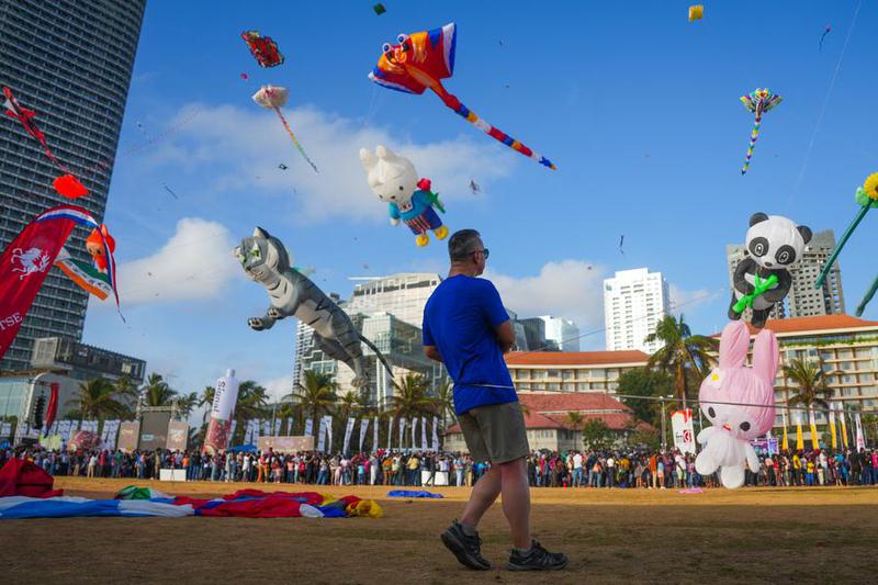 Orang-orang mengamati layang-layang dalam Festival Layang-layang Internasional Kolombo (Colombo International Kite Festival) di Kolombo, Sri Lanka, pada 24 Agustus 2025. (Carapandang/Xinhua/Thilina Kaluthotage)