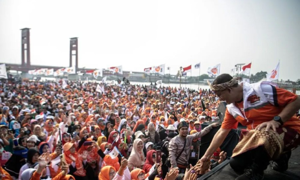 CARAPANDANG - Bakal calon presiden dari Koalisi Perubahan untuk Persatuan Anies Baswedan mengikuti senam sehat bersama dengan para kader Partai Keadilan Sejahtera (PKS) di pelataran Benteng Kuto Besak (BKB), Kota Palembang, Sumatra Selatan, Minggu.