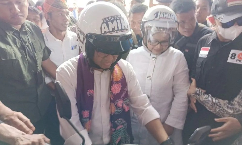 Dengan menggunakan sepeda motor matic, Anies dan istri menggunakan helm berwarna putih. Di bagian depan helm Anies tampak bertuliskan "Ekspedisi AMIN", sedangkan di helm istrinya tertulis "1 Anies-Muhaimin (AMIN)".