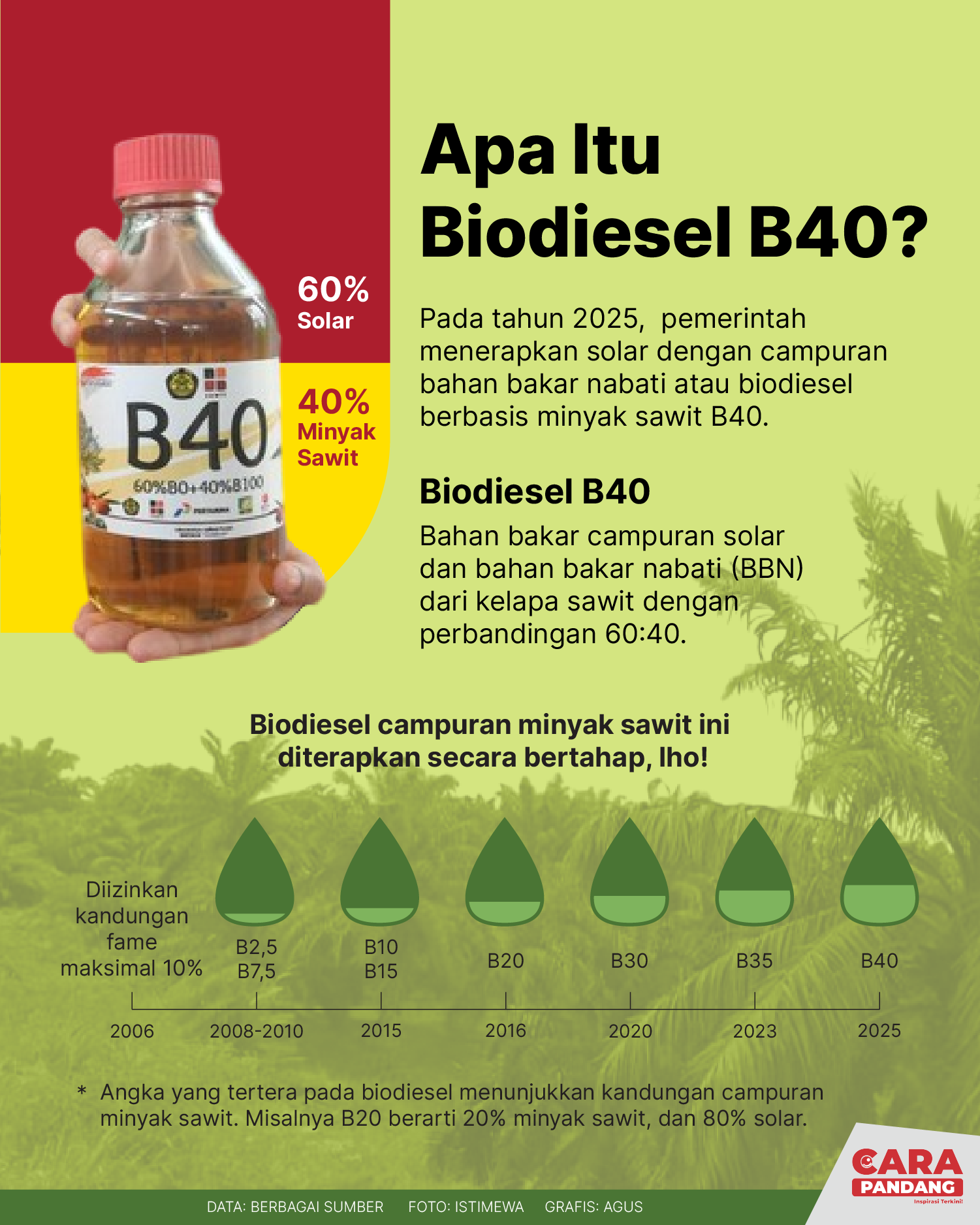 Beranda Infografis Apa itu Biodiesel B40? Infografis Apa itu Biodiesel B40? Penulis Amira Izzati - 13 Februari 2025 20:46 0 CARAPANDANG - 2025, Pemerintah menerapkan solar dengan campuran bahan bakar nabati atau biodiesel berbasis B40. Tags Berita Sebelumnya Prabowo Ditunjuk Kembali Jadi Ketua Umum Gerindra Berita Berikutnya Indonesia Dalam Dilema Misi Perdamaian Dunia LEAVE A REPLY Cancel reply Comment: Please enter your comment! Name:* Please enter your name here Email:* You have entered an incorrect email address! Please enter your email address here Website: Save my name, email, and website in this browser for the next time I comment. Berita Teratas Kisah Ajaib Nabi Sulaiman dan Anak yang Berbakti kepada Orang Tua 8 Cara Merawat Kucing Kesayangan Agar Tubuhnya Selalu Sehat Minuman yang Mampu Redakan Batuk yang Menganggu Manfaat Ajaib Bawang Putih Bagi Kesehatan 8 Cara Menjaga Kesehatan Gigi dan Mulut yang Efektif Berita Terkait Berita Terkait Wajah Baru PP Tunas: Garda Terdepan Perlindungan Anak Indonesia Zoel Rachman - 31 Maret 2026 09:42 MBG 5 Hari Sepekan Masih Wacana Maliq - 30 Maret 2026 11:49 Presiden Ingin Semua Kendaraan Dikonversi ke Listrik Maliq - 30 Maret 2026 11:48 Kewaijiban PSE Terhadap Pengguna Anak Maliq - 30 Maret 2026 11:15
