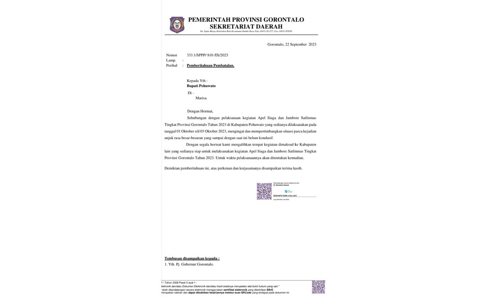 Pembatalan tersebut disampaikan Pemprov Gorontalo melalui Surat Pemberitahuan Pembatalan Nomor : 333.1/SPPP/ 810 /IX/2023 yang ditandatangani oleh Pj. Sekretaris Daerah, Budiyanto Sidiki.