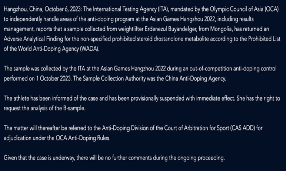 Menurut ITA, pengambilan sampel dilakukan oleh lembaga tersebut di Asian Games Hangzhou dalam kontrol antidoping di luar kompetisi pada 1 Oktober, yang menemukan bahwa Buyandelger dinyatakan positif mengonsumsi zat terlarang tanpa spesifikasi berupa metabolit drostanolone steroid.