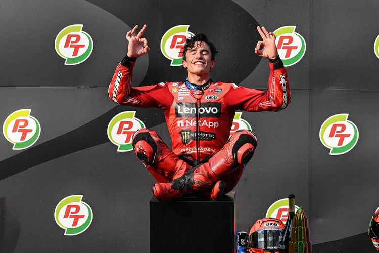 CARAPANDANG - Pembalap Ducati Lenovo Marc Marquez berhasil menjadi pemenang MotoGP Ceko 2025 di Sirkuit Brno, Minggu (20/7/2025). Balapan berlangsung ketat sejak start.
