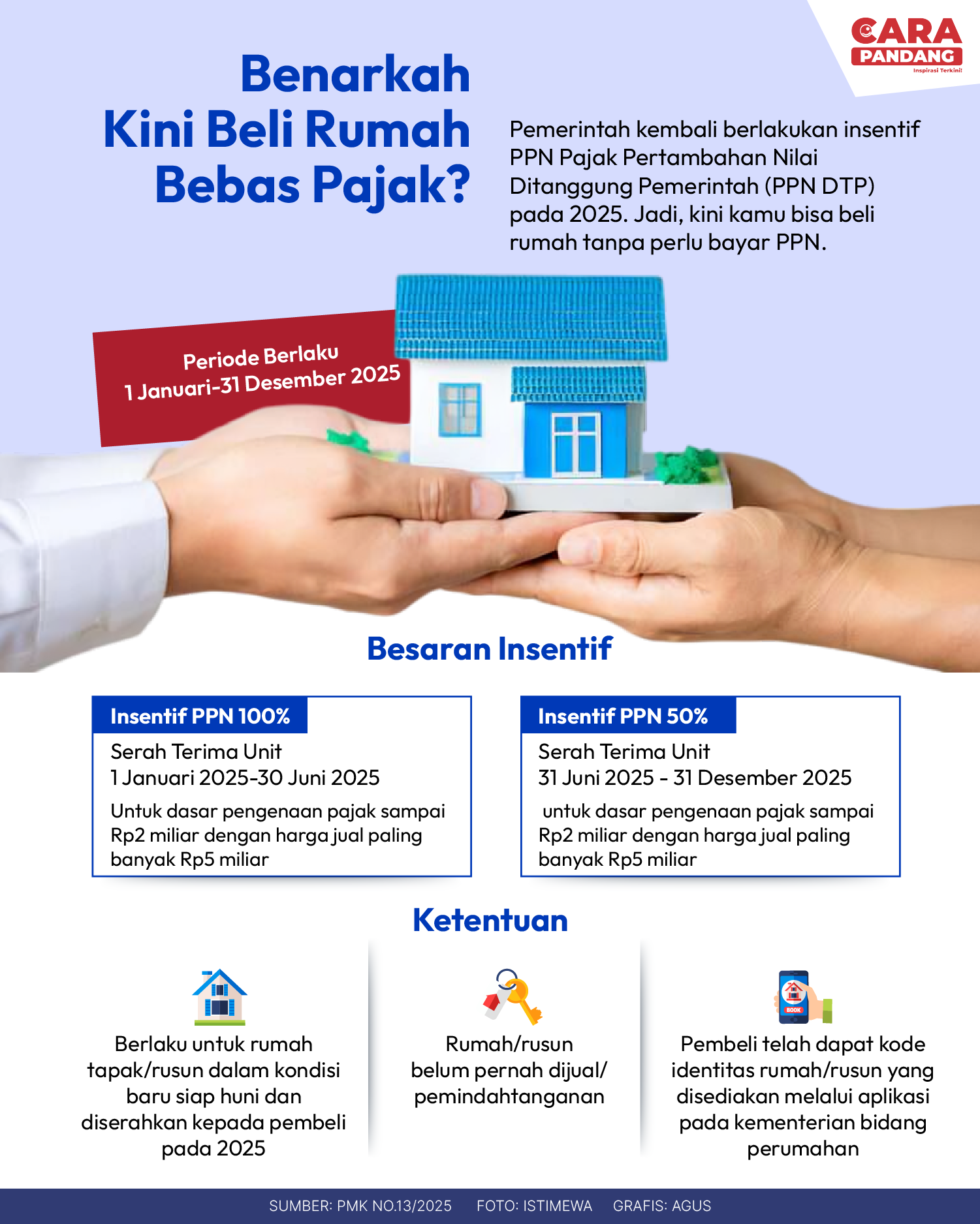 Beranda Infografis Beli Rumah Bebas Pajak Infografis Beli Rumah Bebas Pajak Penulis Amira Izzati - 15 Februari 2025 20:18 0 CARAPANDANG - Pemerintah kembali menerapkan PTN DTP pada 2025. Jadi, beli rumah tanpa perlu bayar PPN. Tags Berita Sebelumnya Kemenkes Imbau Masyarakat Waspadai Penyakit DBD di Musim Hujan Berita Berikutnya Indonesia Dalam Dilema Misi Perdamaian Dunia LEAVE A REPLY Cancel reply Comment: Please enter your comment! Name:* Please enter your name here Email:* You have entered an incorrect email address! Please enter your email address here Website: Save my name, email, and website in this browser for the next time I comment. Berita Teratas Kisah Ajaib Nabi Sulaiman dan Anak yang Berbakti kepada Orang Tua 8 Cara Merawat Kucing Kesayangan Agar Tubuhnya Selalu Sehat Minuman yang Mampu Redakan Batuk yang Menganggu Manfaat Ajaib Bawang Putih Bagi Kesehatan 8 Cara Menjaga Kesehatan Gigi dan Mulut yang Efektif Berita Terkait Berita Terkait Wajah Baru PP Tunas: Garda Terdepan Perlindungan Anak Indonesia Zoel Rachman - 31 Maret 2026 09:42 MBG 5 Hari Sepekan Masih Wacana Maliq - 30 Maret 2026 11:49 Presiden Ingin Semua Kendaraan Dikonversi ke Listrik Maliq - 30 Maret 2026 11:48 Kewaijiban PSE Terhadap Pengguna Anak Maliq - 30 Maret 2026 11:15