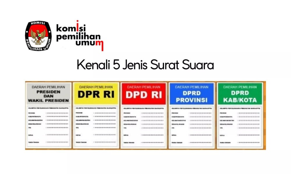 Ada lima surat suara yang akan diberikan untuk masyarakat dengan hak pilih. Kelimanya yaitu surat suara pemilihan presiden dan wakil presiden, DPR RI, DPRD provinsi, DPRD kabupaten/kota, dan DPD.