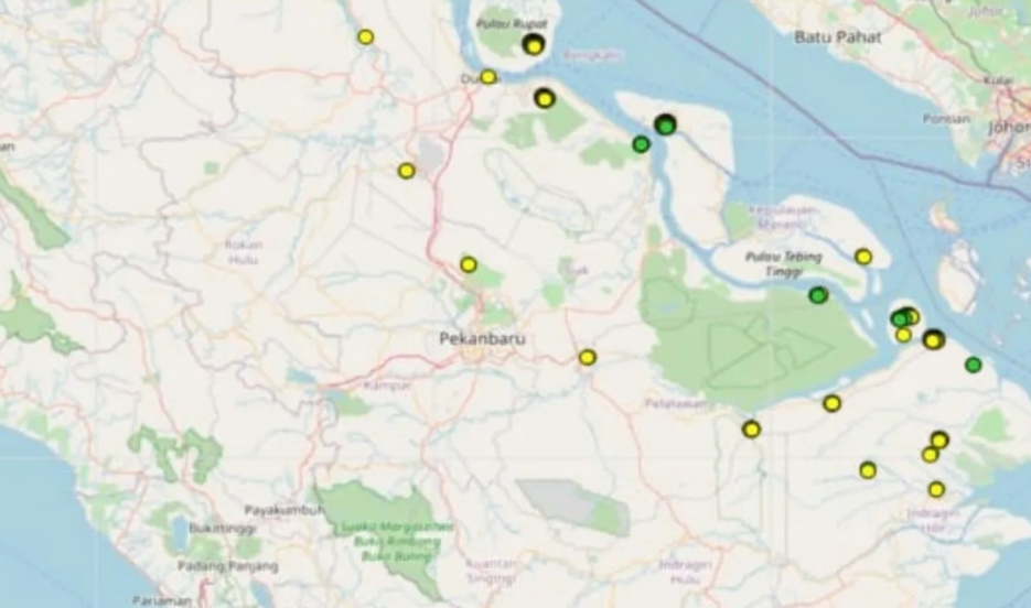 Sebaran titik panas lainnya terdapat di Indragiri Hilir (18 titik), Siak (6 titik), Kepulauan Meranti (2 titik), serta Rokan Hilir dan Kota Dumai masing-masing satu titik.