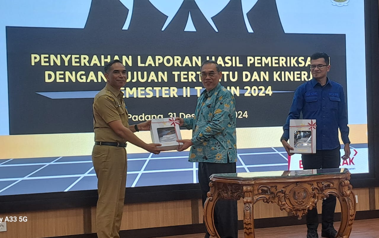 SOLOK, CARAPANDANG - Pemerintah Daerah Kabupaten Solok Menerima Laporan Hasil Pemeriksaan (LHP) Kinerja atas efektivitas upaya pemerintah daerah dalam mengembangkan destinasi Wisata Kawasan Danau Kembar sebagai Kawasan Wisata Unggulan Tahun 2023 sampai dengan 2024 di Kantor BPK RI Perwakilan Sumbar Padang, Selasa (31/12/2024).
