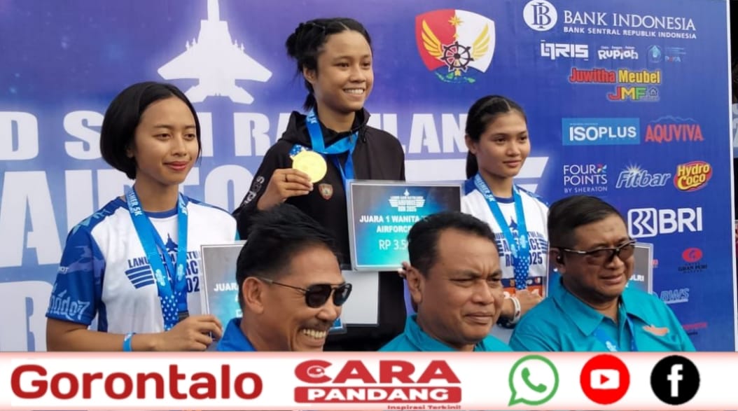 POHUWATO, CARAPANDANG - Prestasi membanggakan kembali ditorehkan oleh personel Polda Gorontalo. Bripda Navesha Hiola, anggota Dit Samapta Polda Gorontalo, berhasil meraih Juara 1 dalam kategori TNI/Polri Runner Putri pada ajang Air Force Run yang digelar di Lanud Sam Ratulangi, Manado, Sulawesi Utara, Sabtu (19/07).