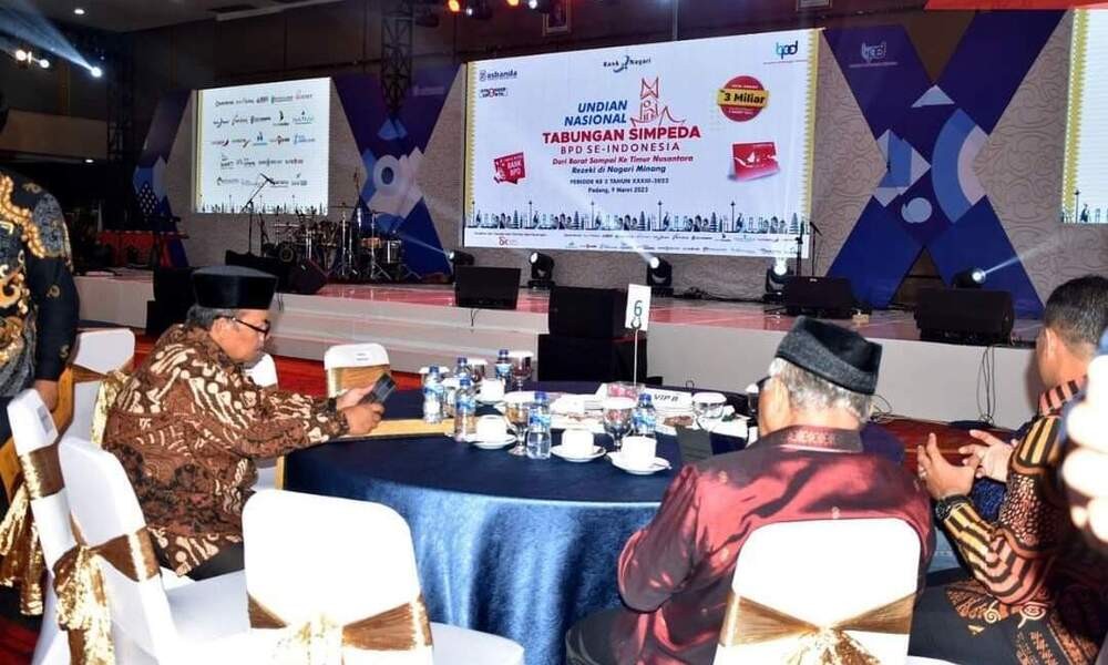 AGAM, CARAPANDANG.COM - Bupati Agam, Dr H Andri Warman MM hadiri undian Nasional tabungan simpeda Bank Pembangunan Daerah (BPD) seluruh Indonesia ke-33, periode ke-2 tahun 2023, di Hotel Truntum Padang, Kamis (9/3).