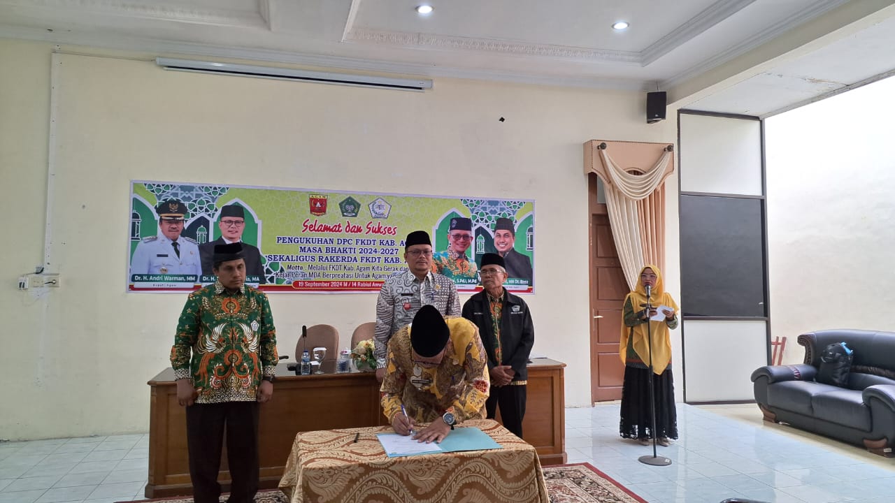 Pengukuhan dilakukan oleh Wakil Ketua DPW FKDT Sumatera Barat Bidang Kurikulum & Pendidikan, Drs. Nasri. Hadir dalam acara tersebut Bupati Agam, Dr. H. Andri Warman, M.M., Kepala Kantor Kementerian Agama Kabupaten Agam, Dr. H. Thomas Febria, S.Ag., M.A., Kepala Bagian Kesra, para Penyuluh Agama, serta Kepala KUA se-Kabupaten Agam.