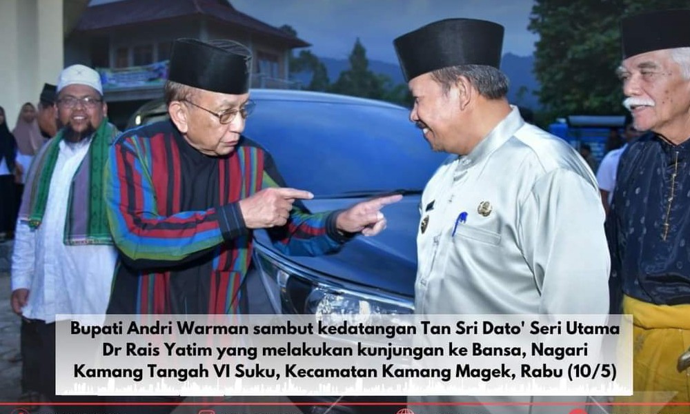 AGAM, CARAPANDANG.COM - Bupati Agam, Dr H Andri Warman sambut kedatangan Tan Sri Dato' Seri Utama Dr Rais Yatim yang melakukan kunjungan ke Bansa, Nagari Kamang Mudiak, Kecamatan Kamang Tangah VI Suku, Rabu (10/5).