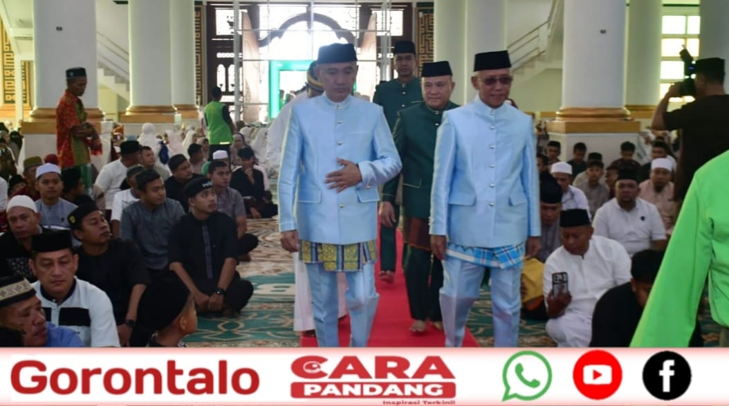 POHUWATO, CARAPANDANG - Bupati Pohuwato, Saipul A. Mbuinga, bersama Wakil Bupati, Iwan S. Adam, melaksanakan Salat Idulfitri di Masjid Agung Baiturrahim, Senin (31/03/2025). Ibadah salat ini diawali dengan prosesi adat turun dari rumah jabatan Bupati menuju Masjid Agung, yang menjadi bagian dari tradisi khas daerah dalam menyambut hari kemenangan setelah sebulan penuh berpuasa.