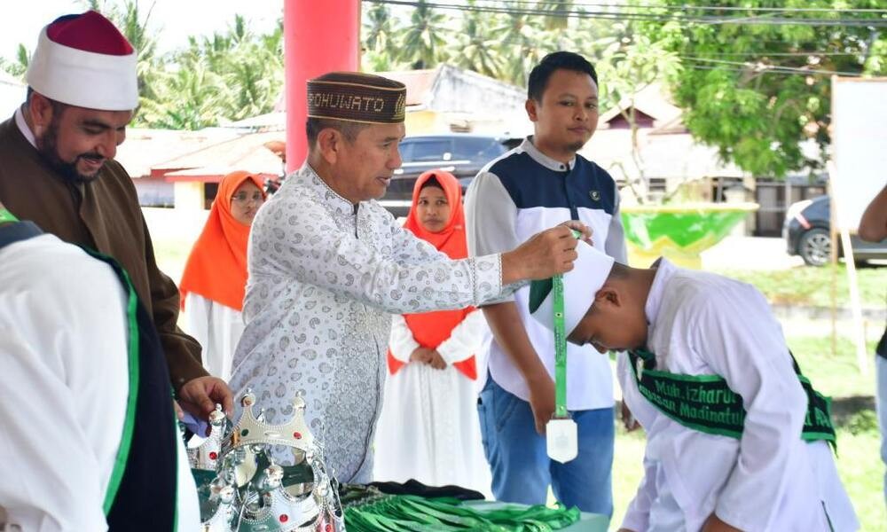 POHUWATO, CARAPANDANG.COM - Bupati Pohuwato, Saipul A. Mbuinga menghadiri wisuda tahfidz angkatan II sekaligus pengukuhan santri karantina 30 juz, 1 desa 1 hafiz Yayasan Madinatul Khairaat Al Fatih (YMDK) Kecamatan Paguat yang dirangkaikan dengan launching program satu desa satu penghafal qur’an, di Playground Taman Paguat, Sabtu, (18/03/2023).