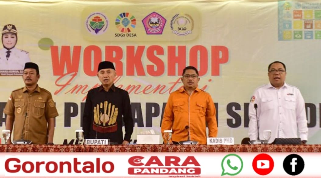 POHUWATO, CARAPANDANG - Workshop penguatan pencapaian SDGs desa bagi kelompok kerja SDGs desa se-Kabupaten Pohuwato dibuka Bupati Pohuwato, Siapul A. Mbuinga, didampingi Kadis PMD, Refli Basir, Ketua APDESI, Sirwan Mohi, dan Pinca Bank Sulut-Go, Hasan Hamid, Senin, (22/07/2024).