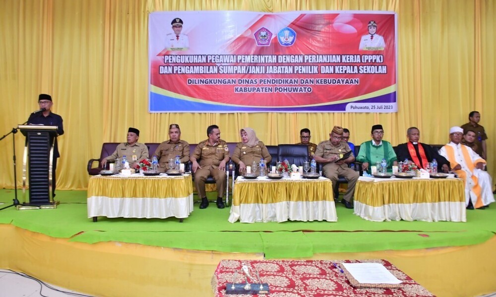 POHUWATO, CARAPANDANG.COM - Sebanyak 274 pegawai pemerintah dengan perjanjian kerja (PPPK) jabatan fungsional guru formasi 2022 dikukuhkan dan diambil sumpah oleh Bupati Pohuwato, Saipul A. Mbuinga di gedung panua kantor bupati. Pelantikan dan pengambilan sumpah PPPK itu turut dihadiri Wakil Bupati, Suharsi Igirisa, Sekda Iskandar Datau, Staf Ahli Bupati, Zulkifli Umar, dan pimpinan OPD, Selasa, (25/7/2023).