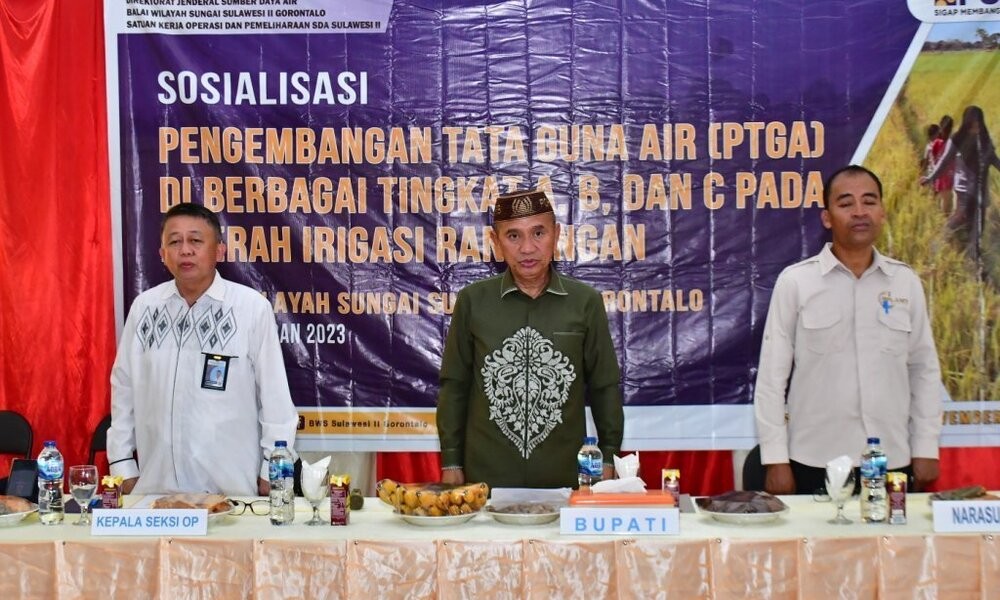 Sosialisasi Pengembangan Tata Guna Air (PTGA) di berbagai tingkat A, B, dan C pada daerah irigasi Randangan yang berlangsung di aula Kantor Camat Patilanggio dibuka Bupati Pohuwato, Saipul A. Mbuinga, Kamis, (16/11/2023).