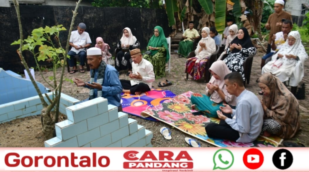 Dalam suasana khidmat, salah satu imam memandu doa di atas pekuburan yang diikuti dengan penuh khusyuk oleh Bupati Saipul A. Mbuinga. Ia turut didampingi oleh sang istri, Selvi Mbuinga Monoarfa, serta saudara-saudaranya.