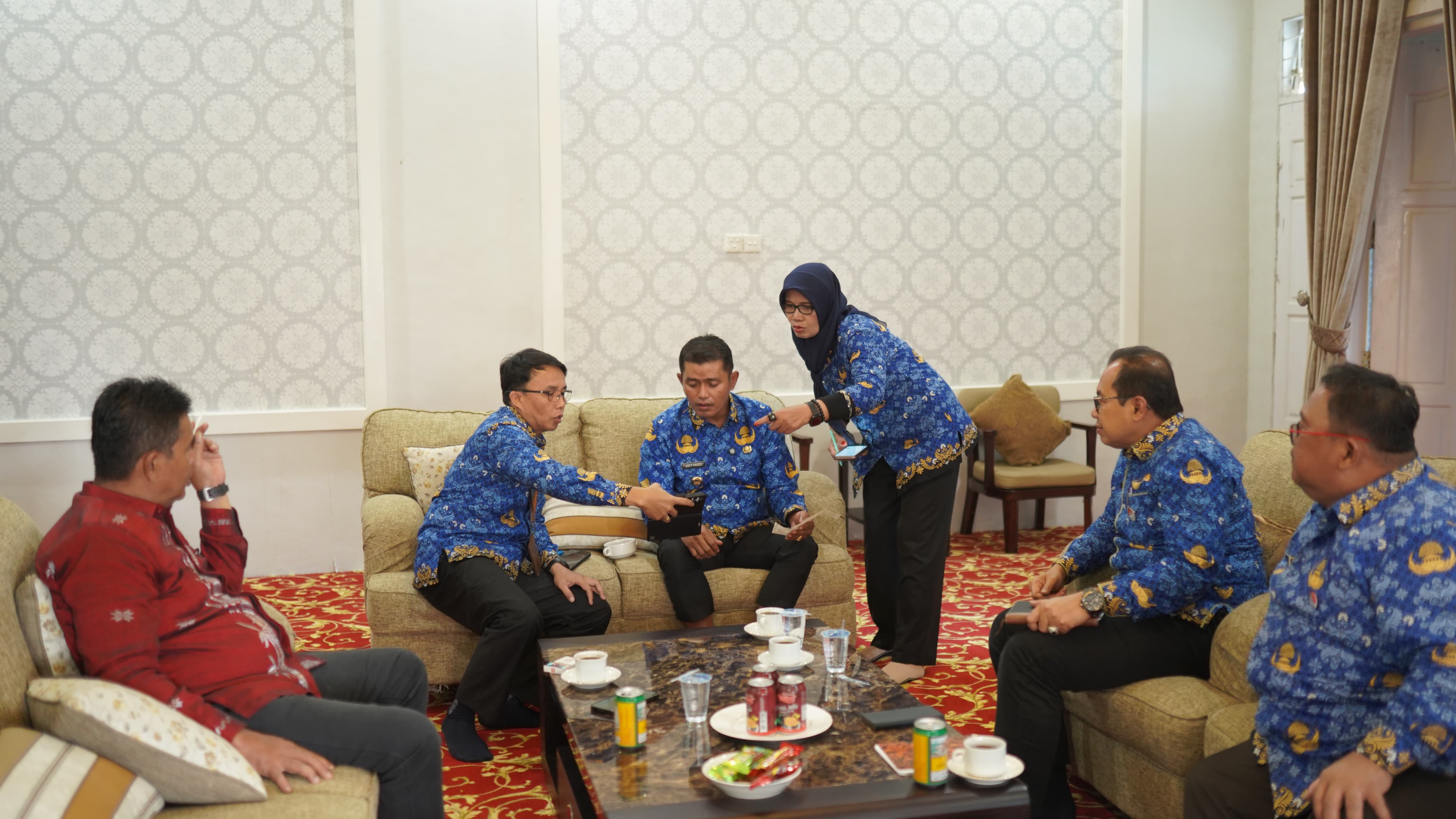 SOLOK, CARAPANDANG - Bupati Solok Jon Firman Pandu, menyambut kedatangan pihak Sistem Administrasi Manunggal Satu Atap (Samsat) Kabupaten Solok di rumah dinas Bupati Arosuka, pada Kamis siang (17/04/2025).