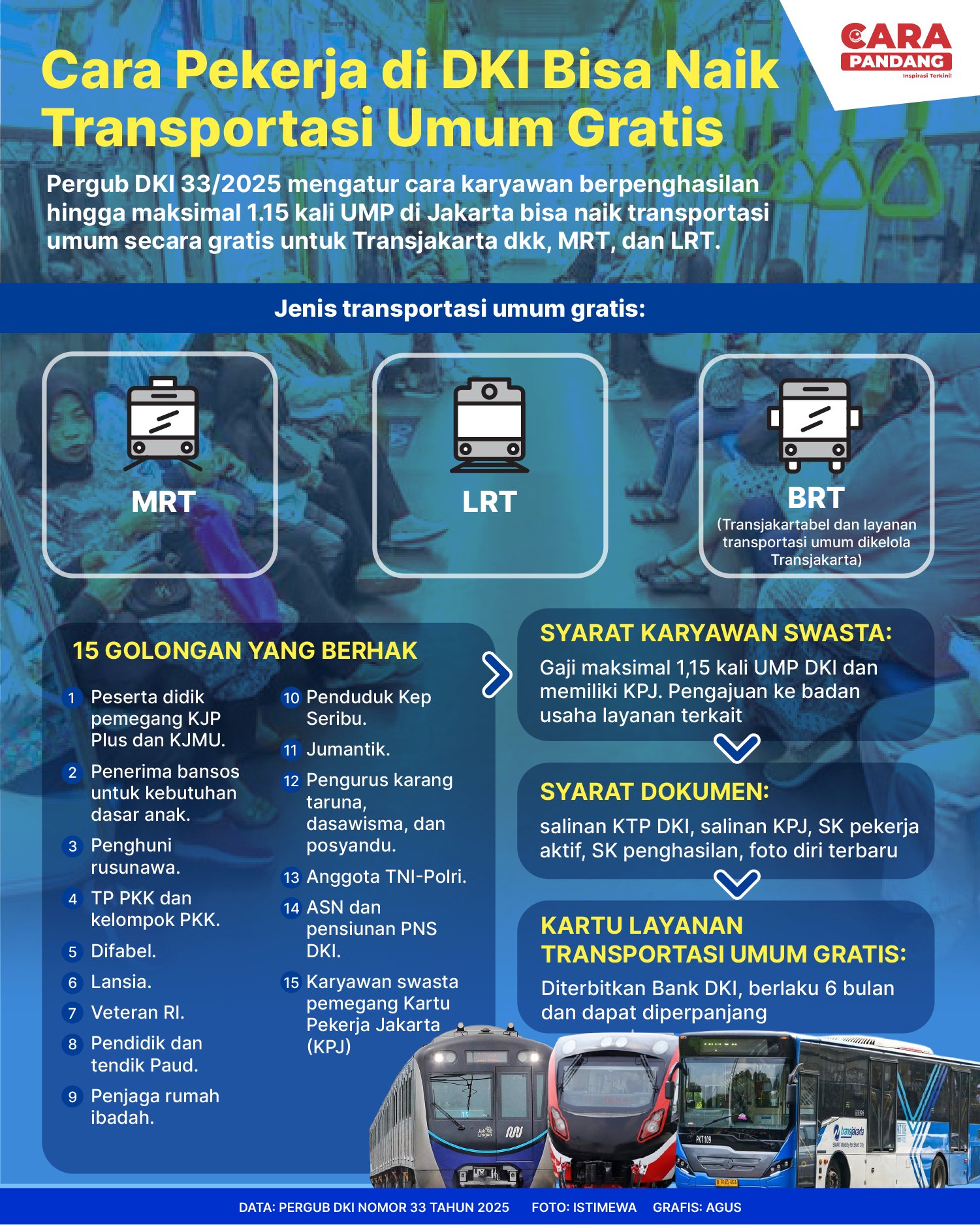 Pergub DKI 22/2025 mengatur cara karyawan berpenghasilan maksimal 1.15 kali UMP di Jakarta bisa naik transportasi umum secara gratis untuk Transjakarta dkk , MRT, dan LRT.