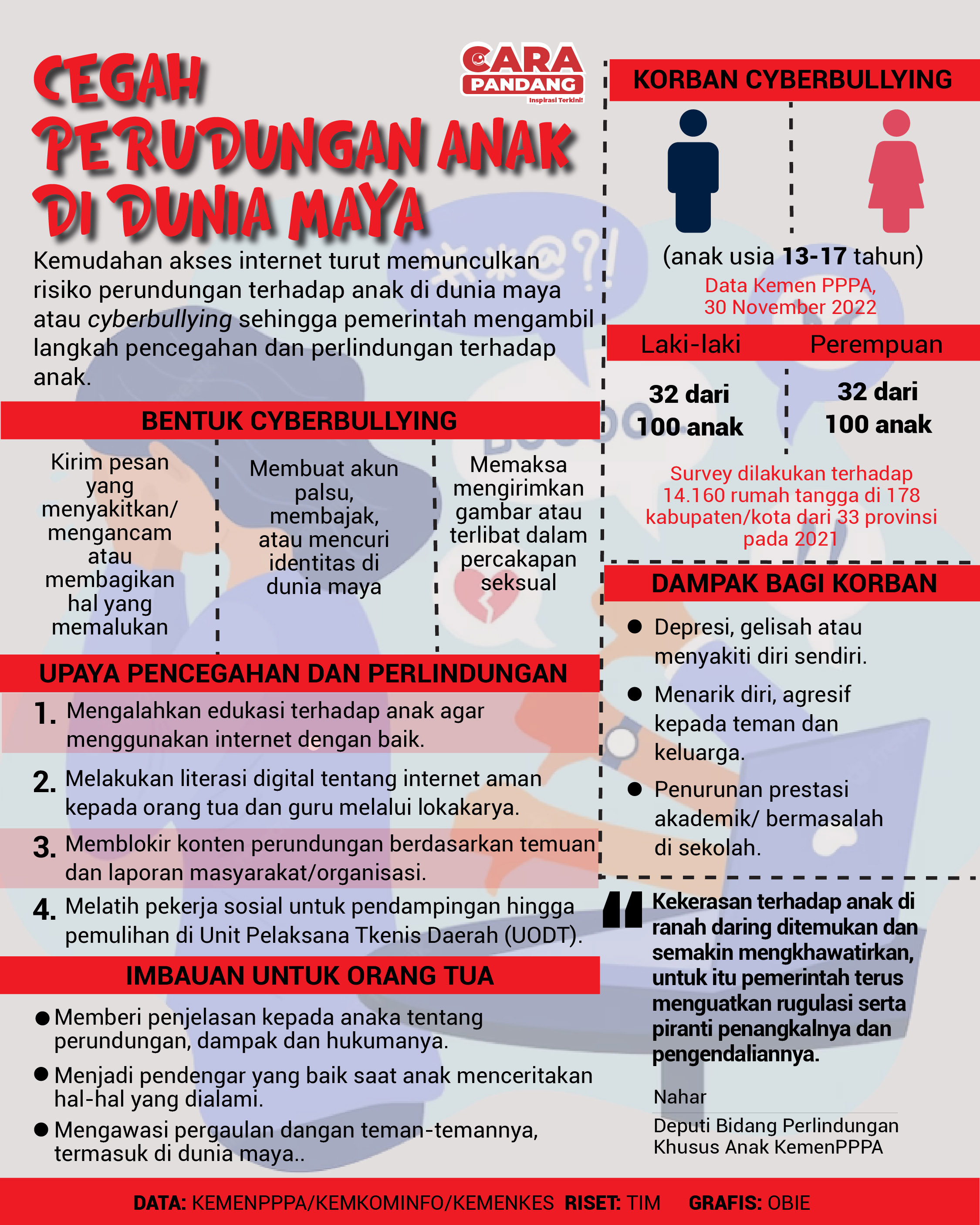 CARAPANDANG - Kemudahan akses internet turut memunculkan risiko perundungan terhadap anak di dunia maya atau cyberbullying sehingga pemerintah mengambil langkah pencegahan dan perlindungan terhadap anak