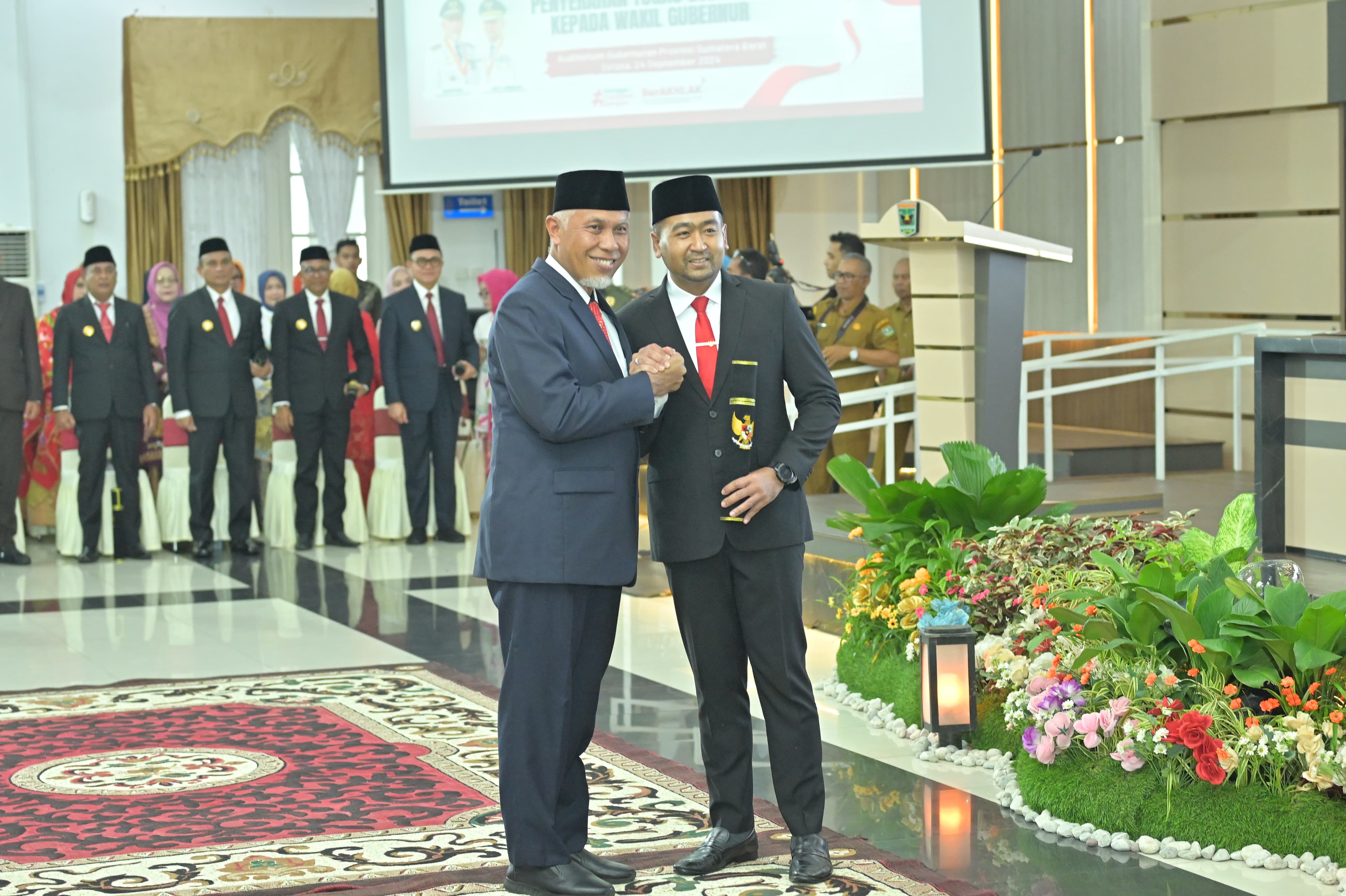 Gubernur Sumatera Barat (Sumbar), Mahyeldi Ansharullah, menyerahkan tugas kepada Wakil Gubernur (Wagub) Audy Joinaldy yang ditunjuk Mendagri sebagai Plt Gubernur.
